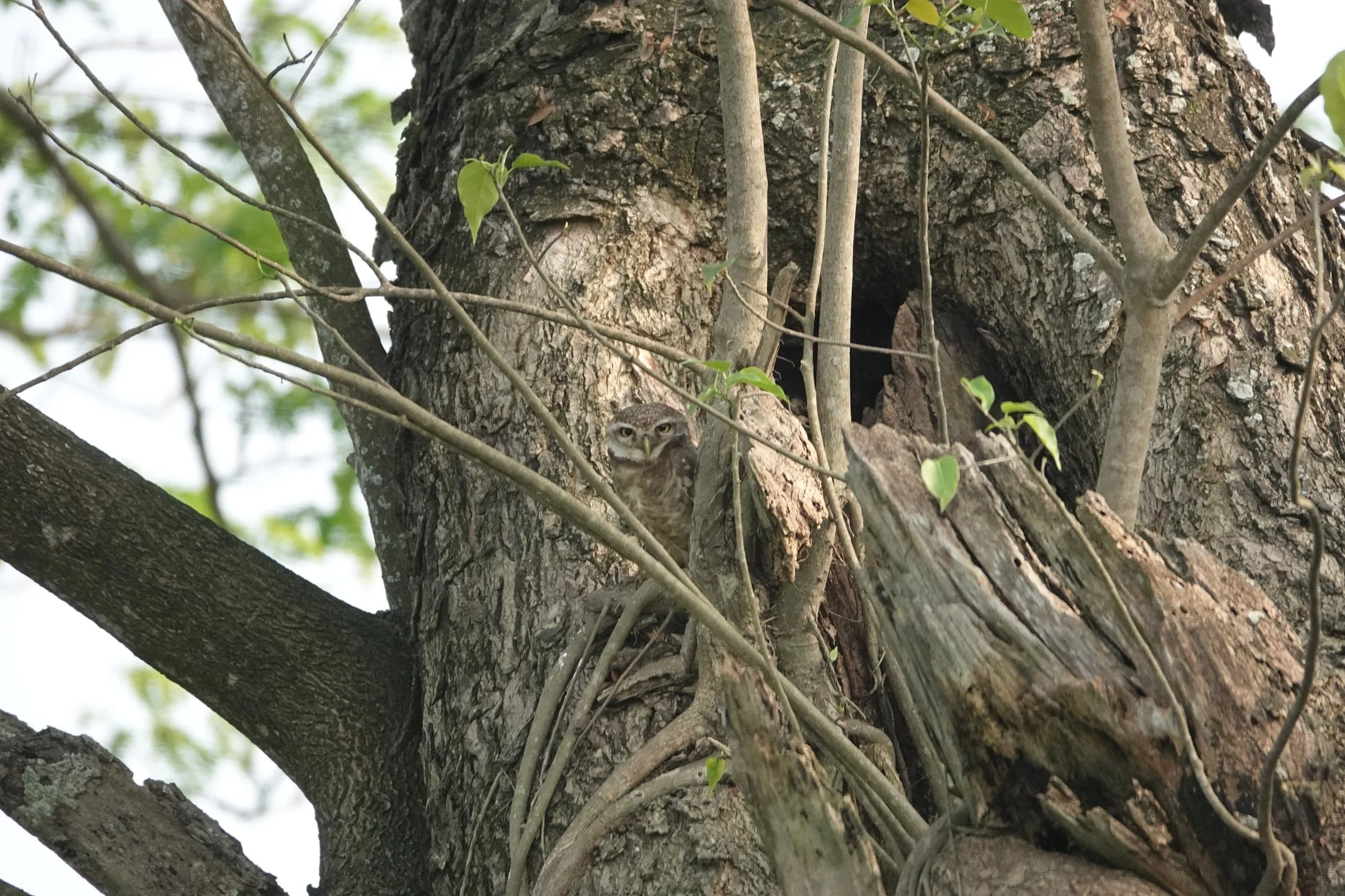 From the dump we went to Deepor Beel, a classic wetlands, in Guwahati. One bird I wanted to see we saw early and often, the cotton pygmy-goose. Other highlights were lesser whistling duck, ferruginous duck, pheasant tailed jacana, Asian openbill, oriental darter, little cormorant, Indian pond-heron, stunningly beautiful chestnut munia, paddyfield pipit, rosy pipit and a pleasant surprise, several lesser adjutant (pictured). The day ended with me finding the spotted owlet (pictured, can you see it?), in the tree it nests in. What an unbelievable day of birding. Prasanna is a spectacular birder and guide. He worked so hard to get me on birds and that’s saying something because sometimes I can be the remedial birder in class. And having Bukey along for the ride was an added bonus. He put me on several birds throughout the day as well. He’ll be great over the next few weeks. On to Eaglenest!
